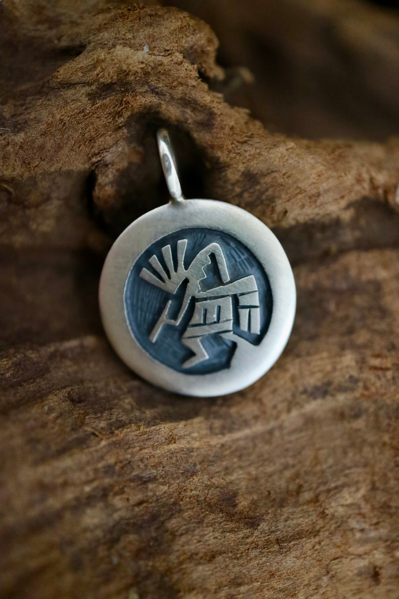モチーフとなっているのは、笛を吹く精霊 ココペリ(Kokopelli)。古くからホピ族やズニ族をはじめとする部族に伝わり、豊穣・音楽・幸運を司るシンボルとして親しまれています。笛を吹きながら旅をする姿は、生命力と喜びを象徴し、身に着ける人にポジティブなエネルギーをもたらすといわれています。