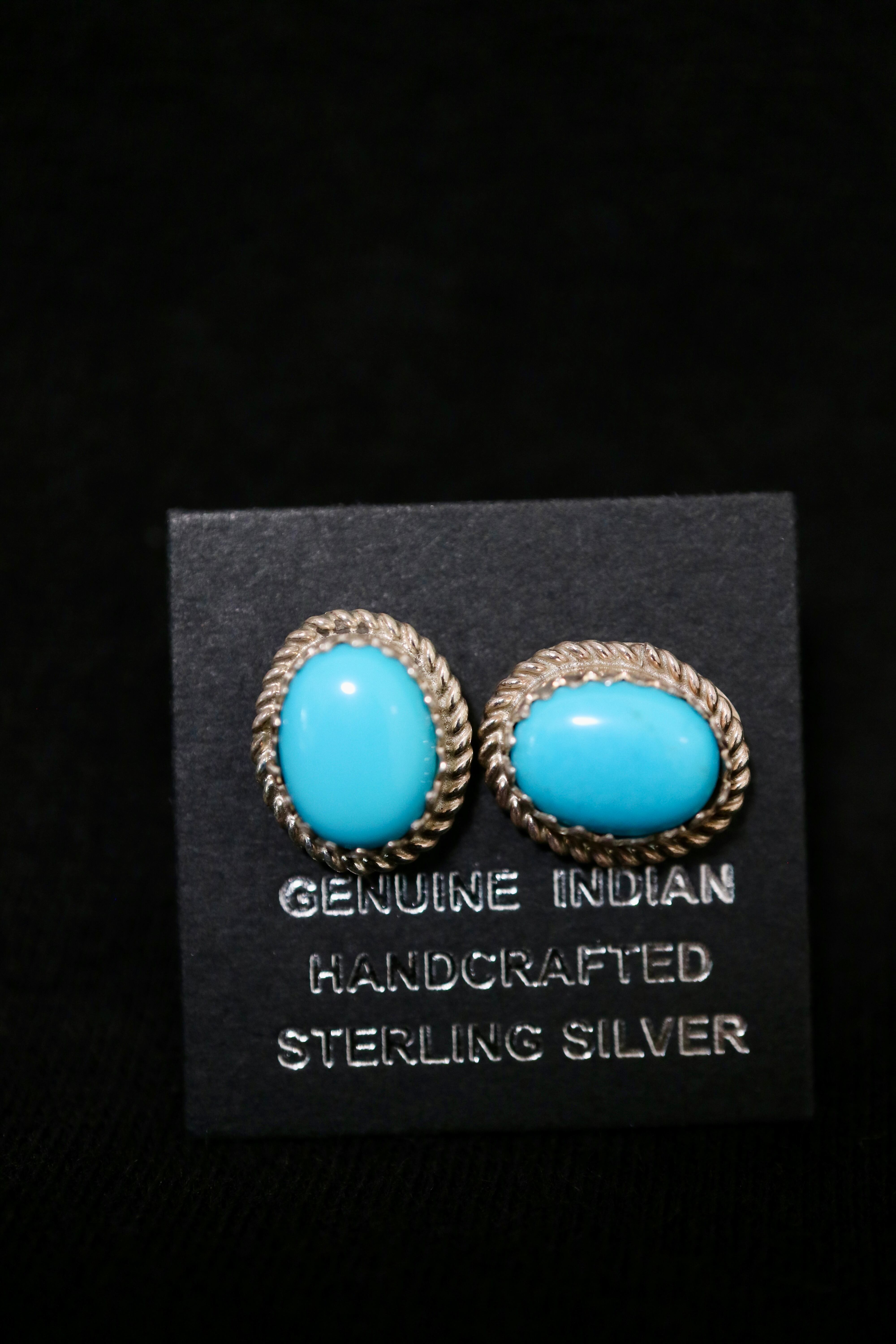 アメリカ南西部のインディアンジュエリーらしい、鮮やかなブルーターコイズをセットしたオーバル型のスタッドピアス。