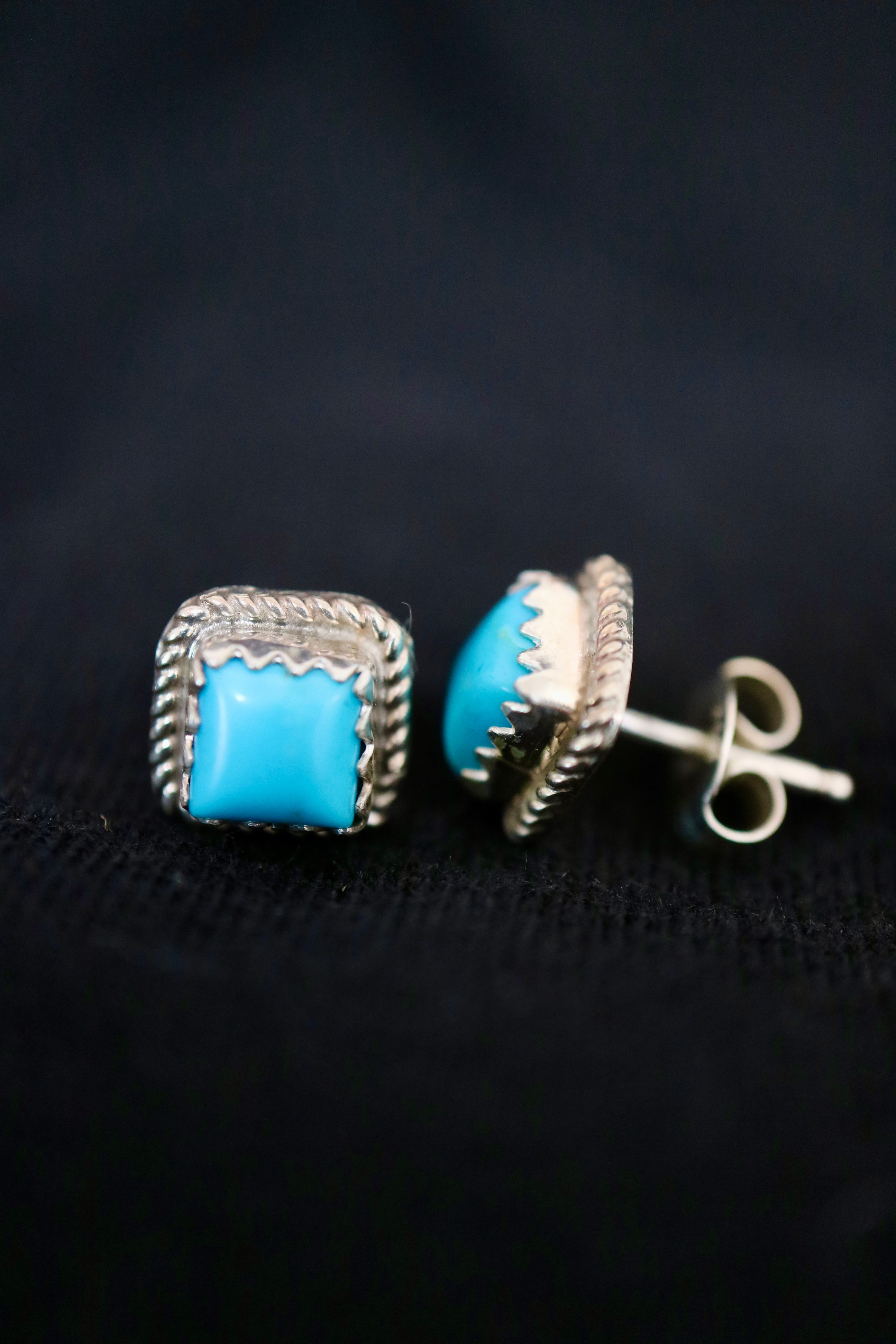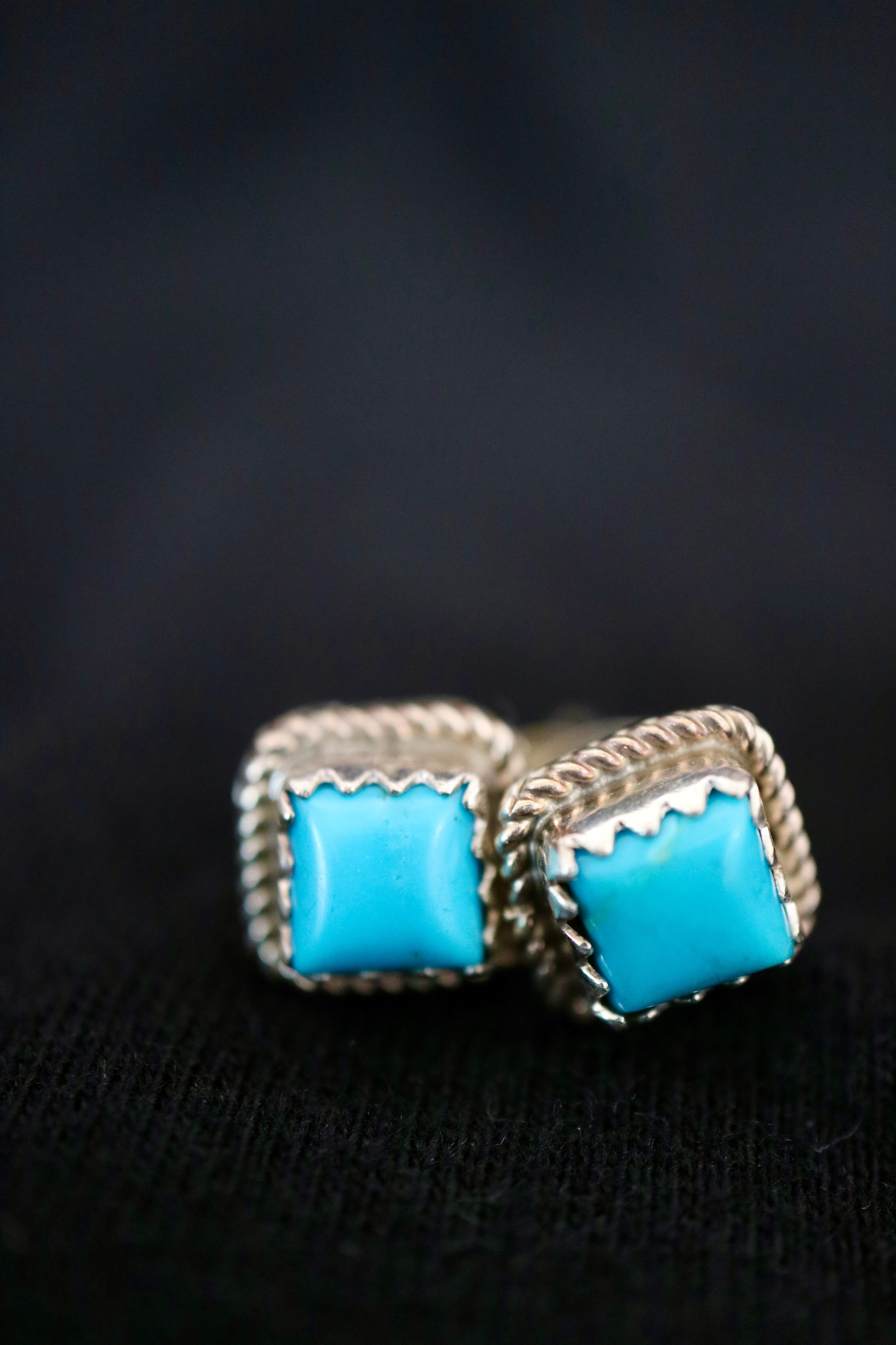 鮮やかなブルーターコイズをスクエア型にカットし、スターリングシルバーで丁寧に囲んだスタッドピアス。