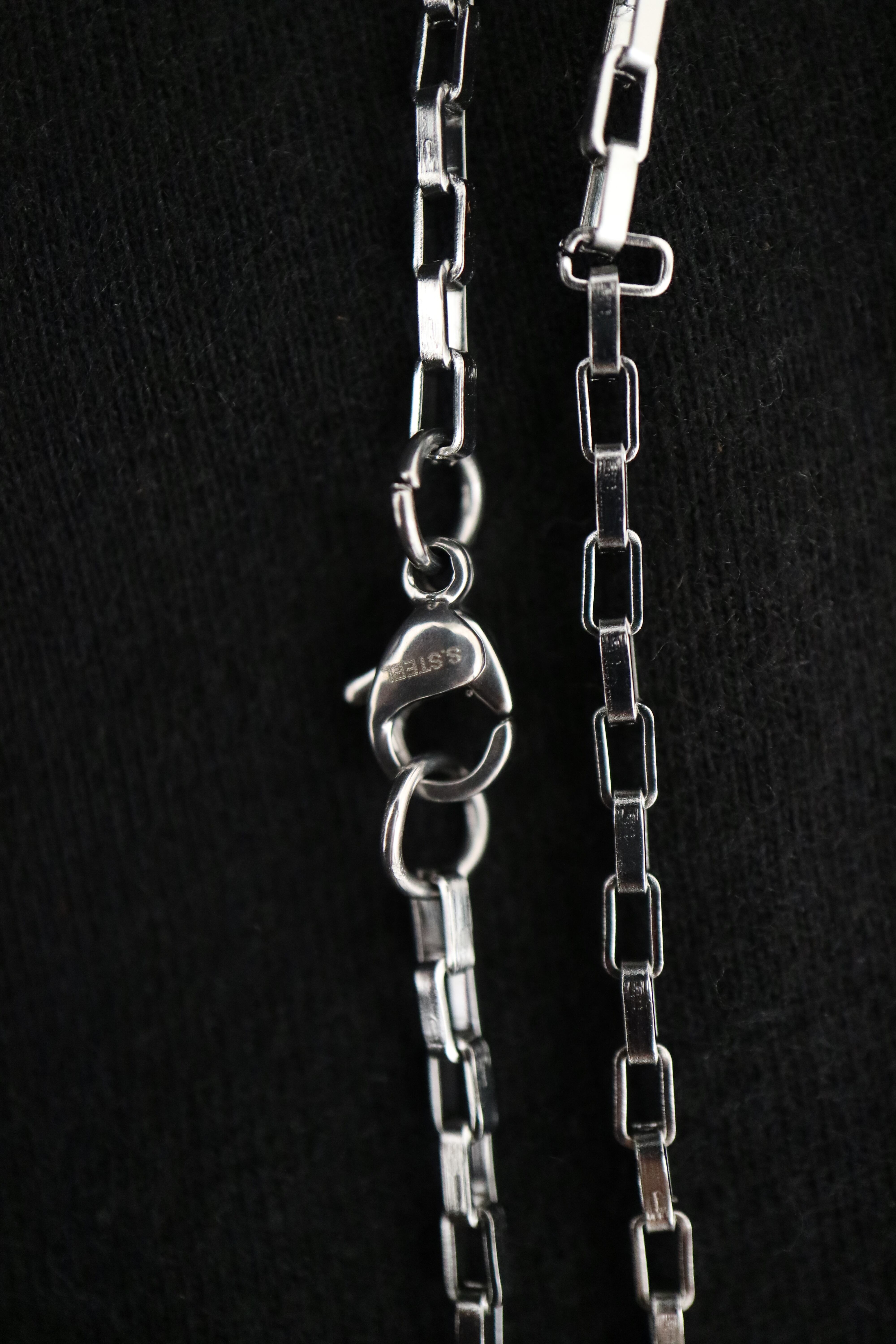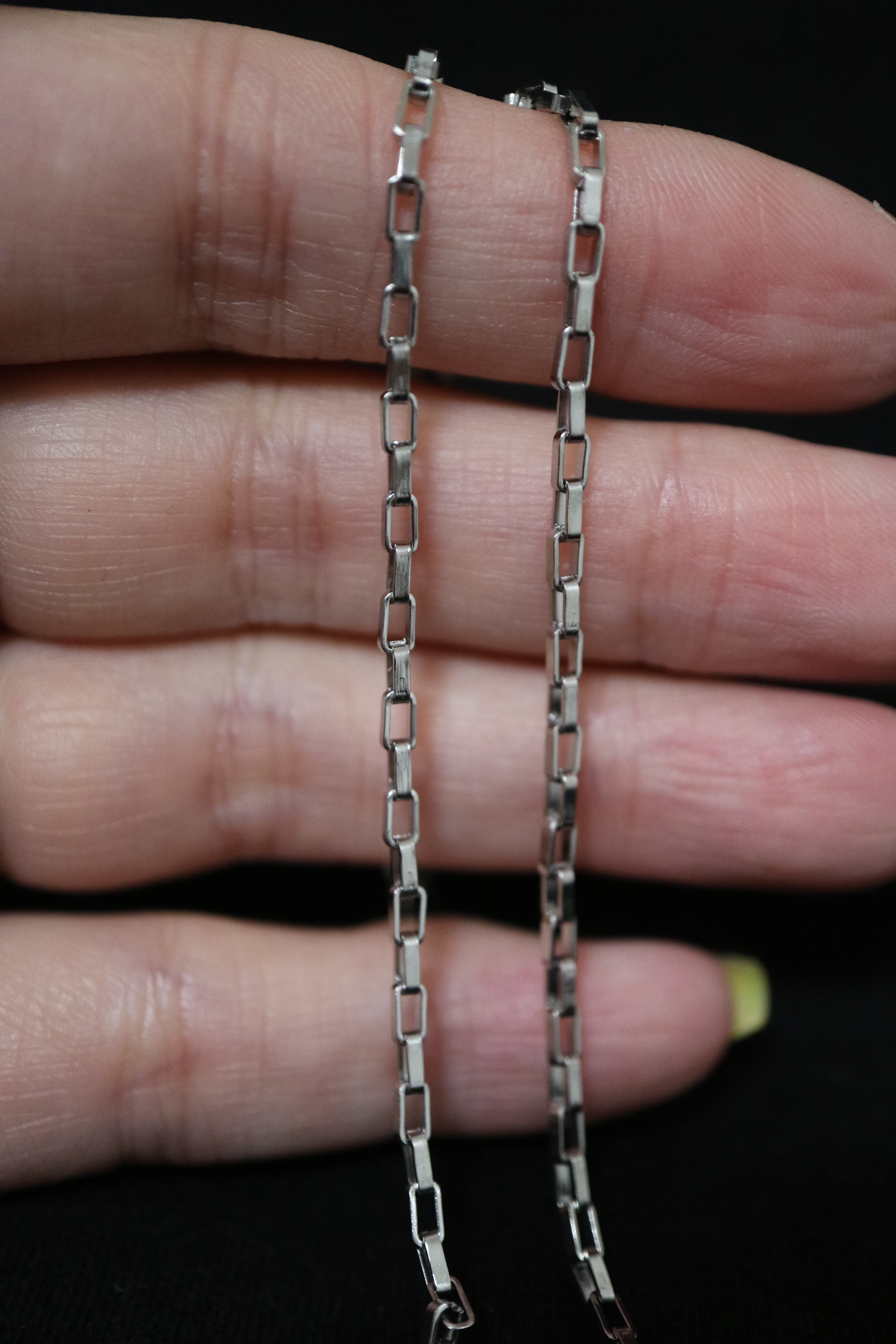 四角いリンクが連なることで、モダンでスタイリッシュな雰囲気を演出します。丸みのあるチェーンとは異なり、シャープな輝きが特徴で、シンプルながら洗練された存在感を放ちます。