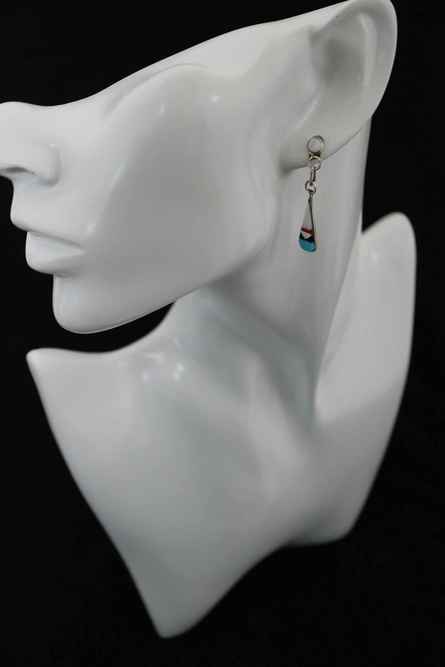 直線的でシャープなティアドロップシルエットと、ズニ族特有の精密な石の象嵌が合わさり、耳元で揺れるたびに美しい色彩が際立ちます。
