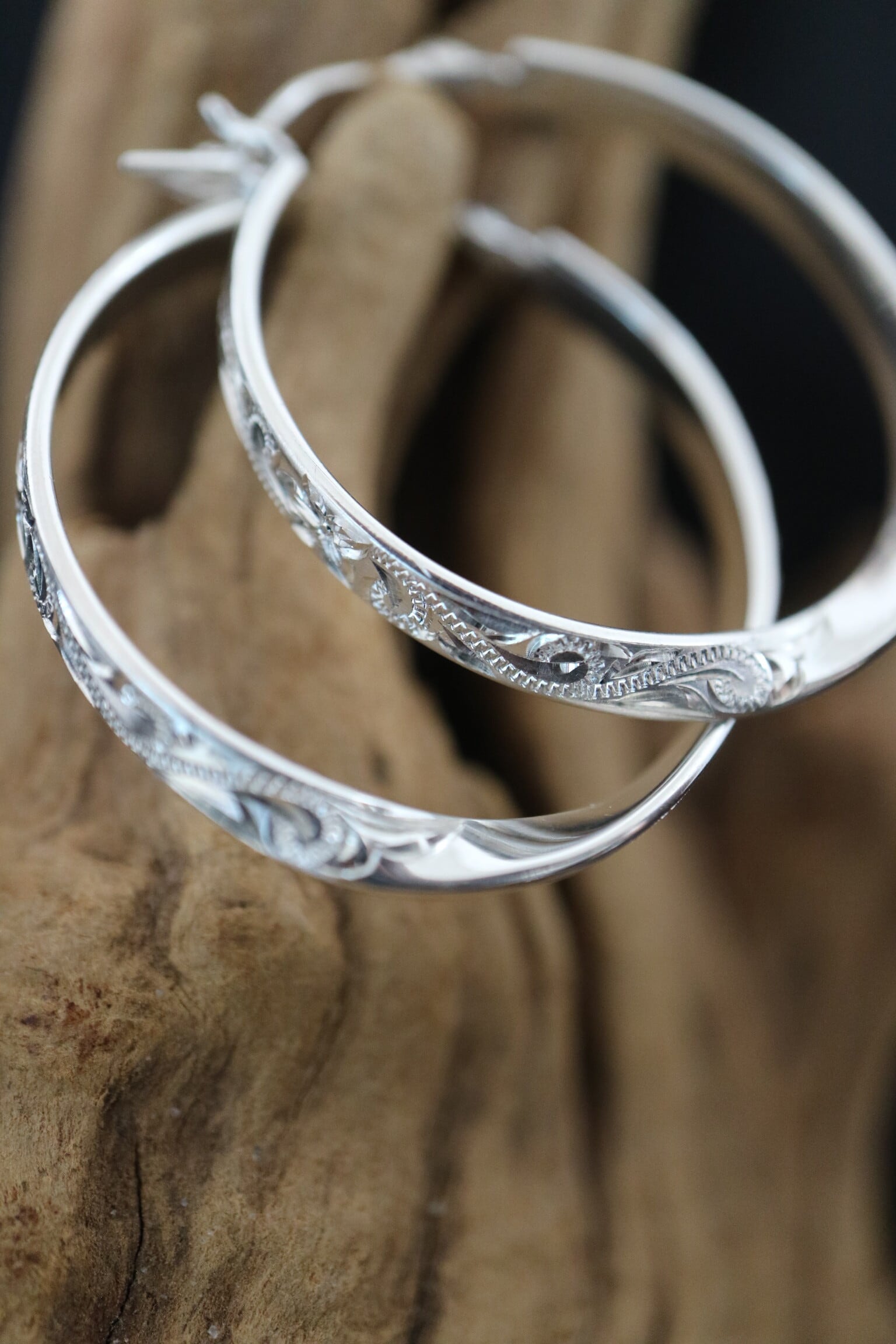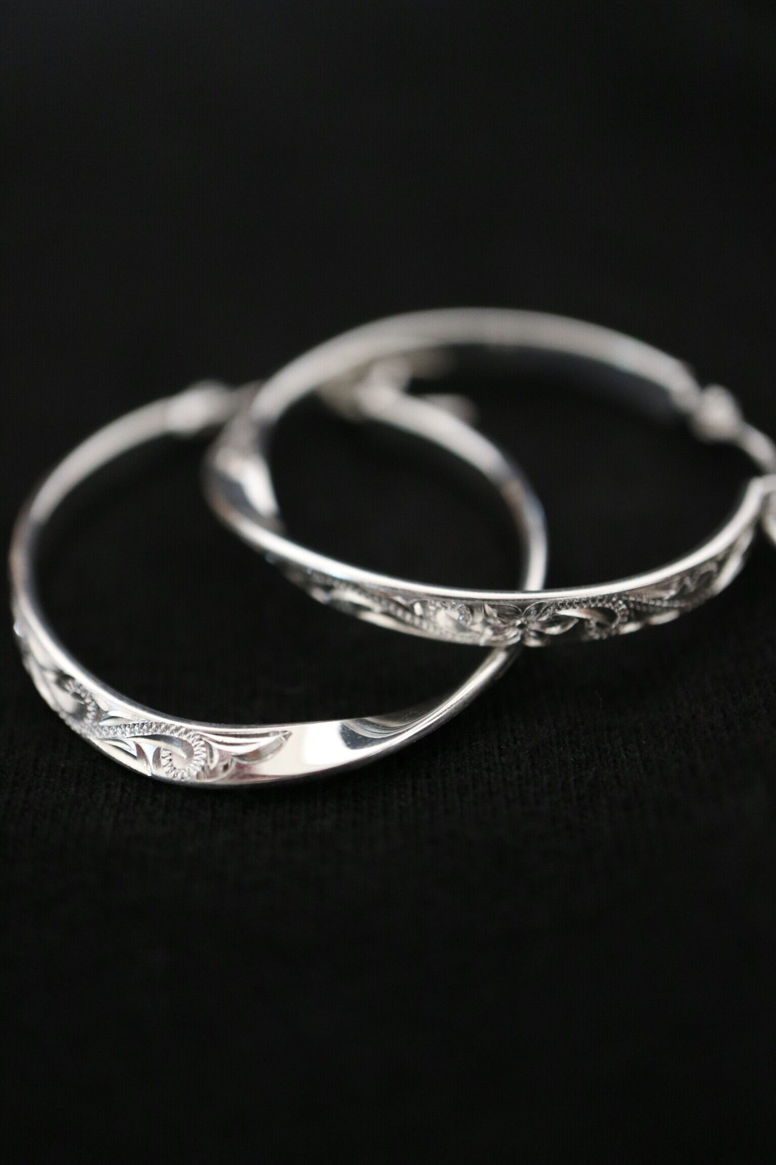 ハワイアンジュエリーの伝統彫りを贅沢にまとった、存在感のあるシルバーフープピアス。