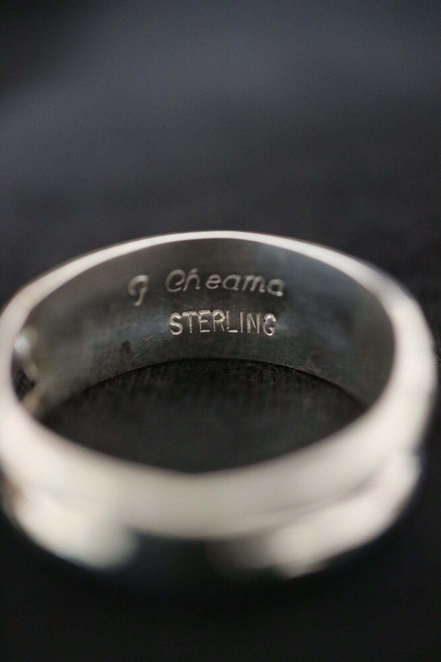 リング内側には “G Cheama” と “STERLING” の刻印が入り、確かな作家性とスターリングシルバー(925)素材であることを示しています。Cheama の作品は、精密な石の配置バランスと、手作業とは思えない滑らかな指通りが特徴で、普段使いにも特別な日の装いにも合わせやすい仕上がりです。