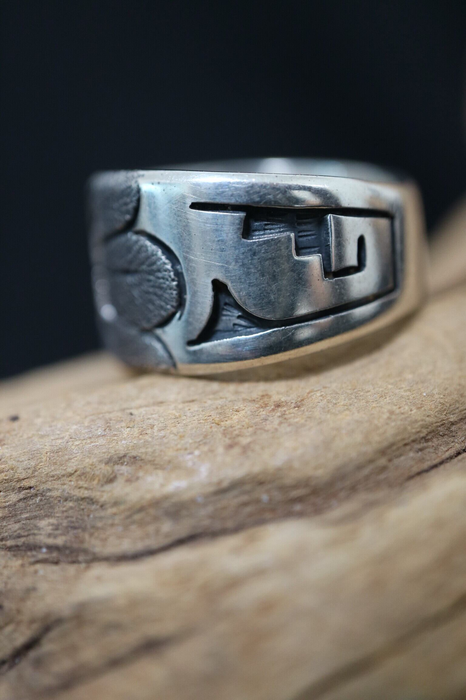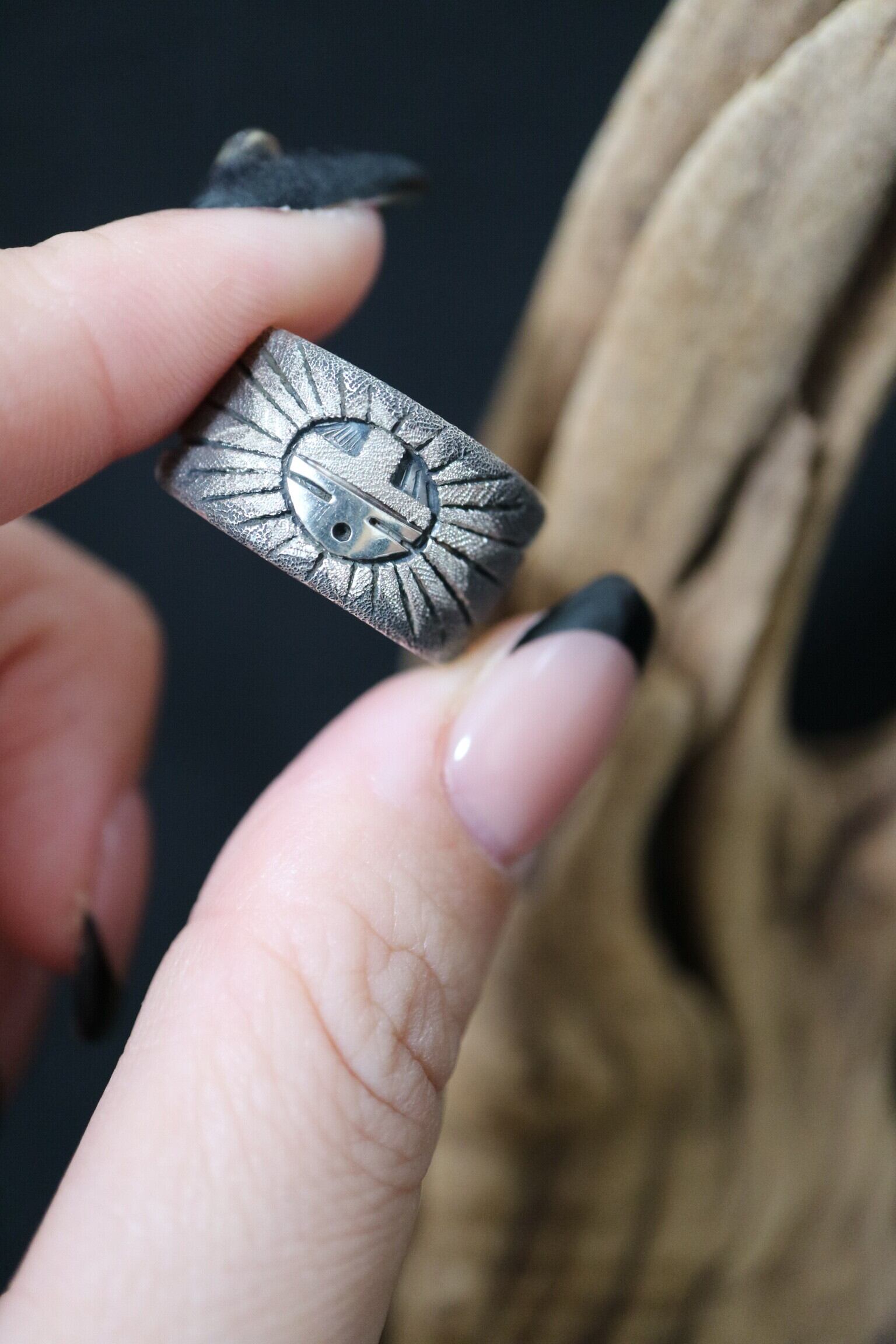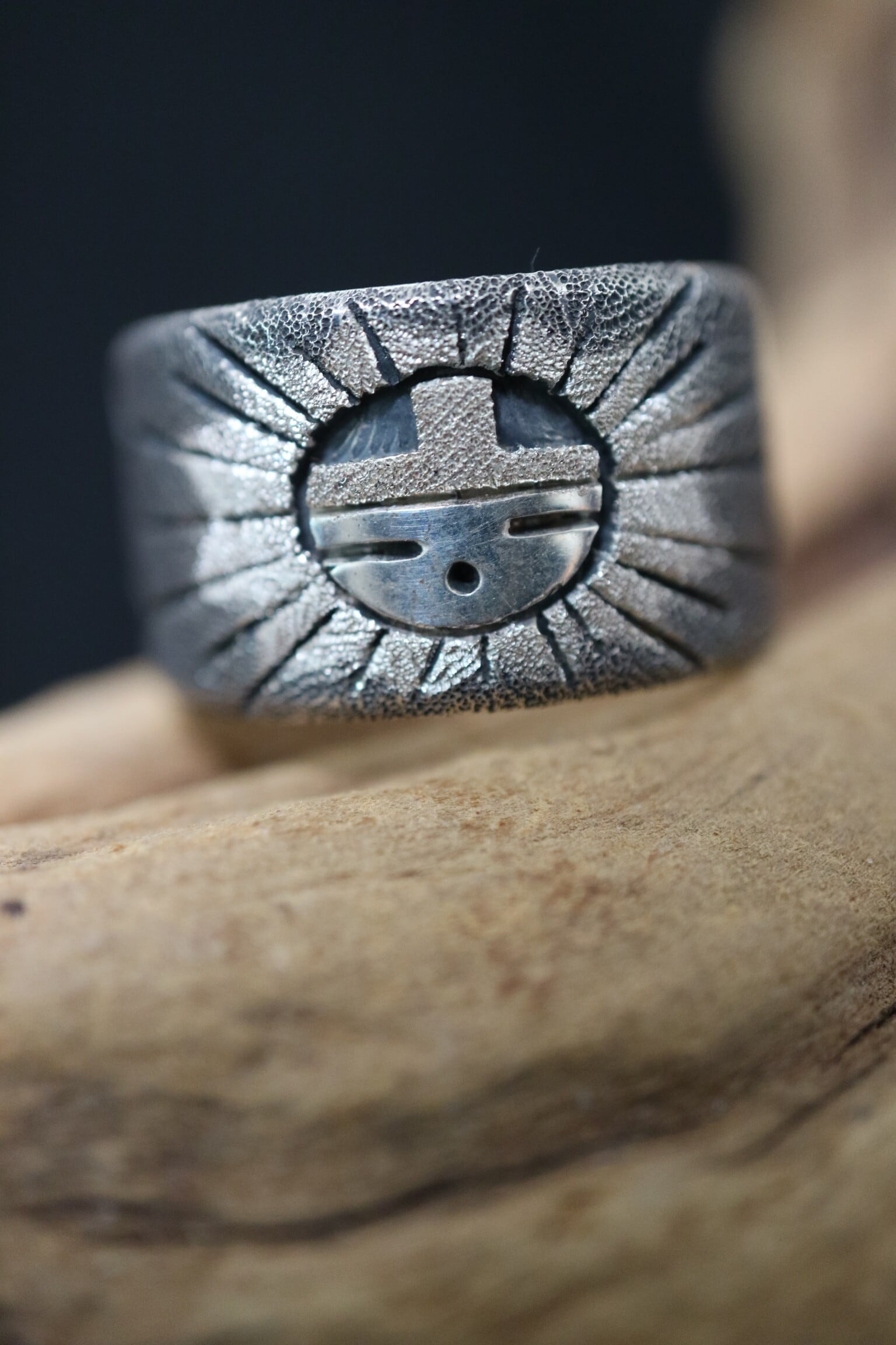 ホピ族の伝統的なオーバーレイ技法で制作された、力強い存在感を放つ サンフェイス(Sunface)リングです。リング正面には太陽を象徴するスンフェイスが立体的にデザインされ、周囲には光が放射状に広がるような彫り込みが施されています。マットで荒らした質感と、繊細に削り出されたラインが美しく対比し、ホピジュエリーらしい神聖さと重厚感を感じる仕上がりです。