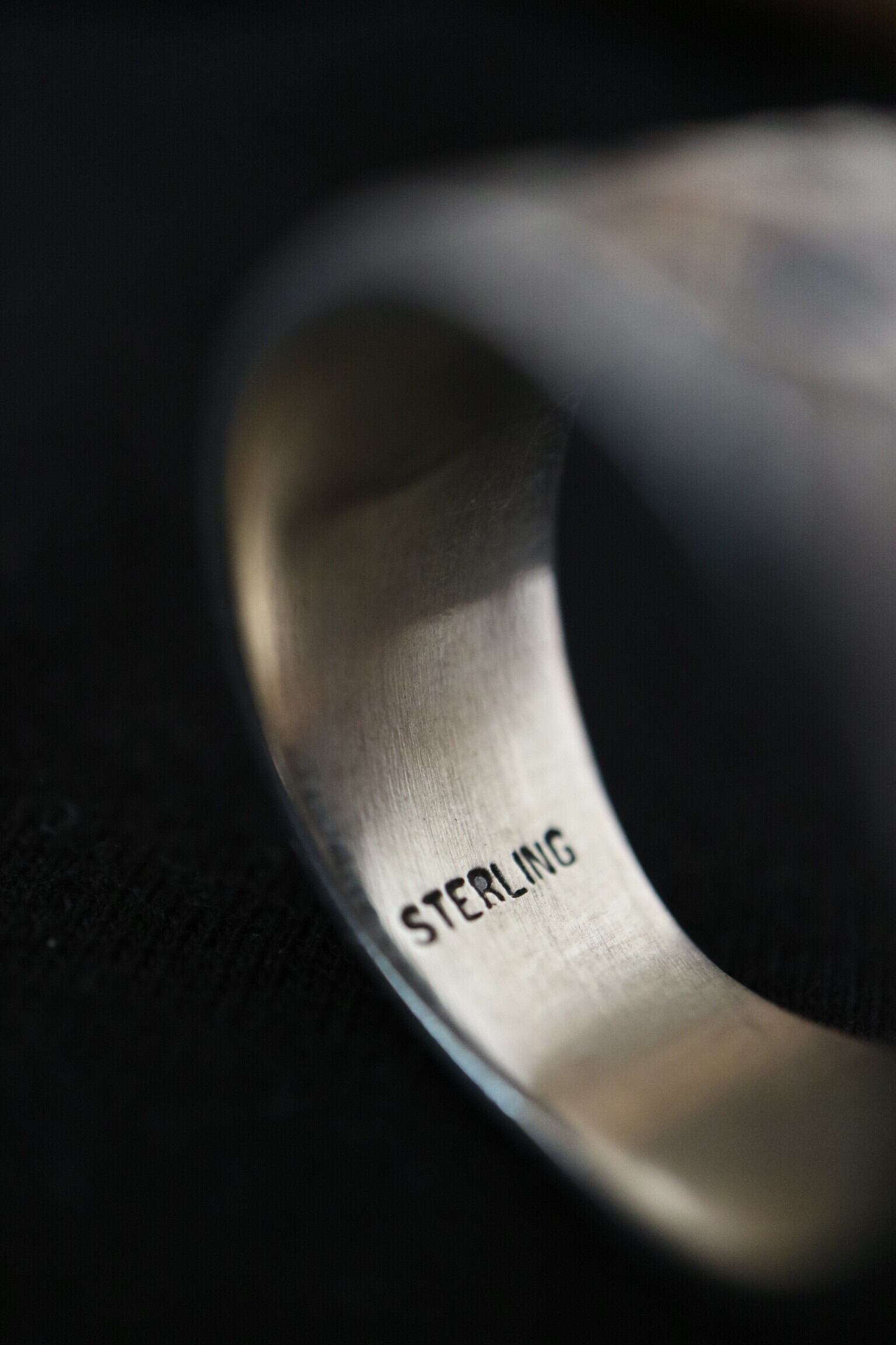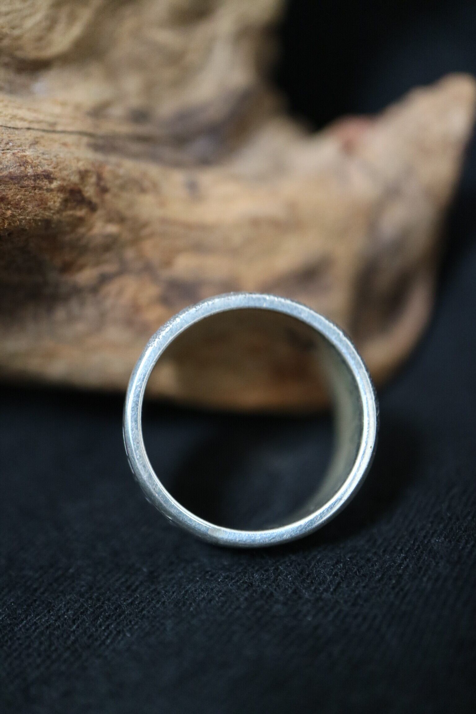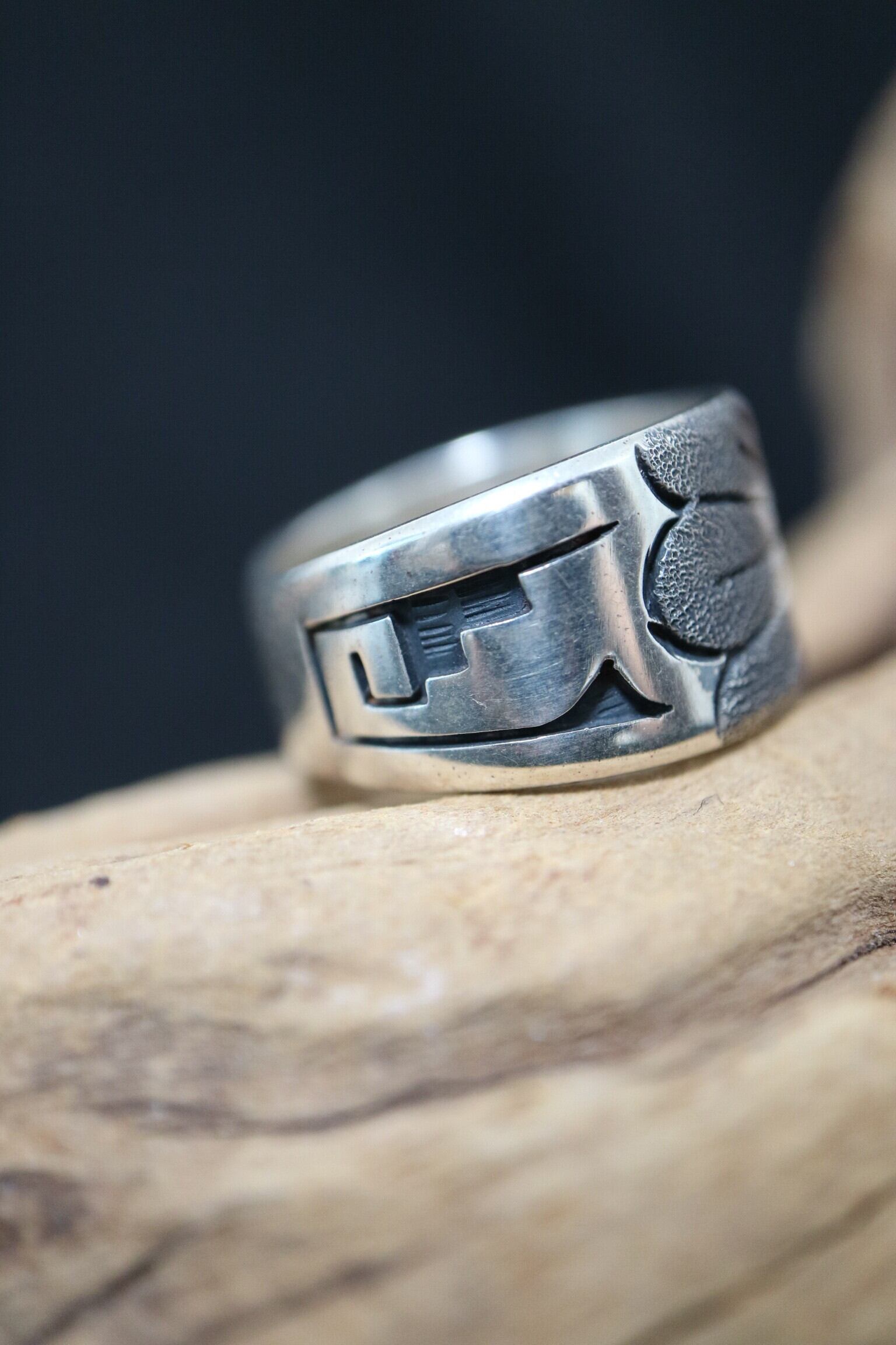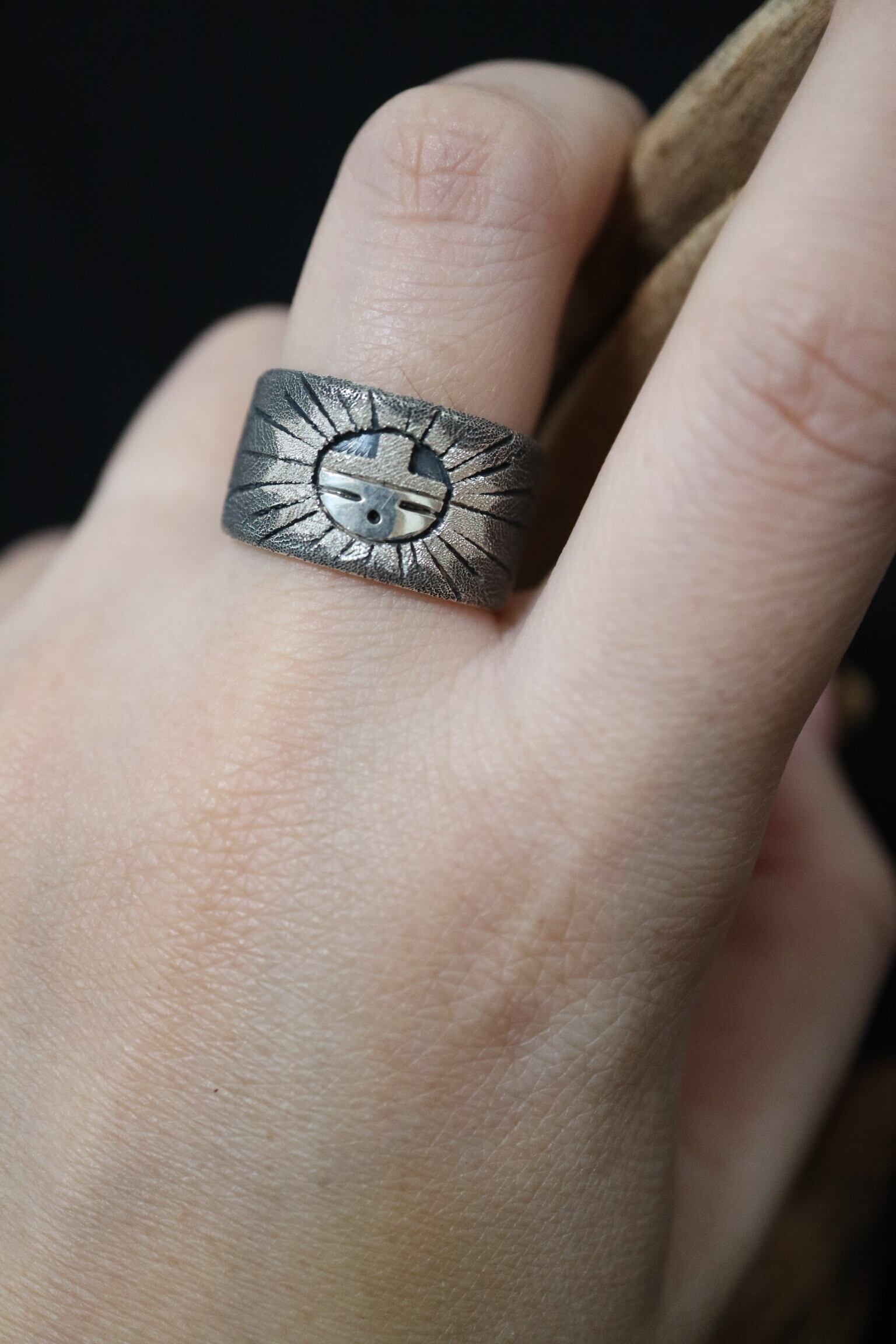 ホピ族の伝統的なオーバーレイ技法で制作された、力強い存在感を放つ サンフェイス(Sunface)リングです。リング正面には太陽を象徴するスンフェイスが立体的にデザインされ、周囲には光が放射状に広がるような彫り込みが施されています。マットで荒らした質感と、繊細に削り出されたラインが美しく対比し、ホピジュエリーらしい神聖さと重厚感を感じる仕上がりです。