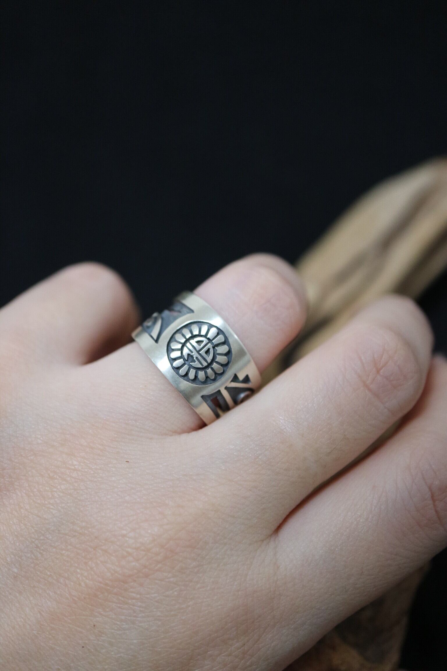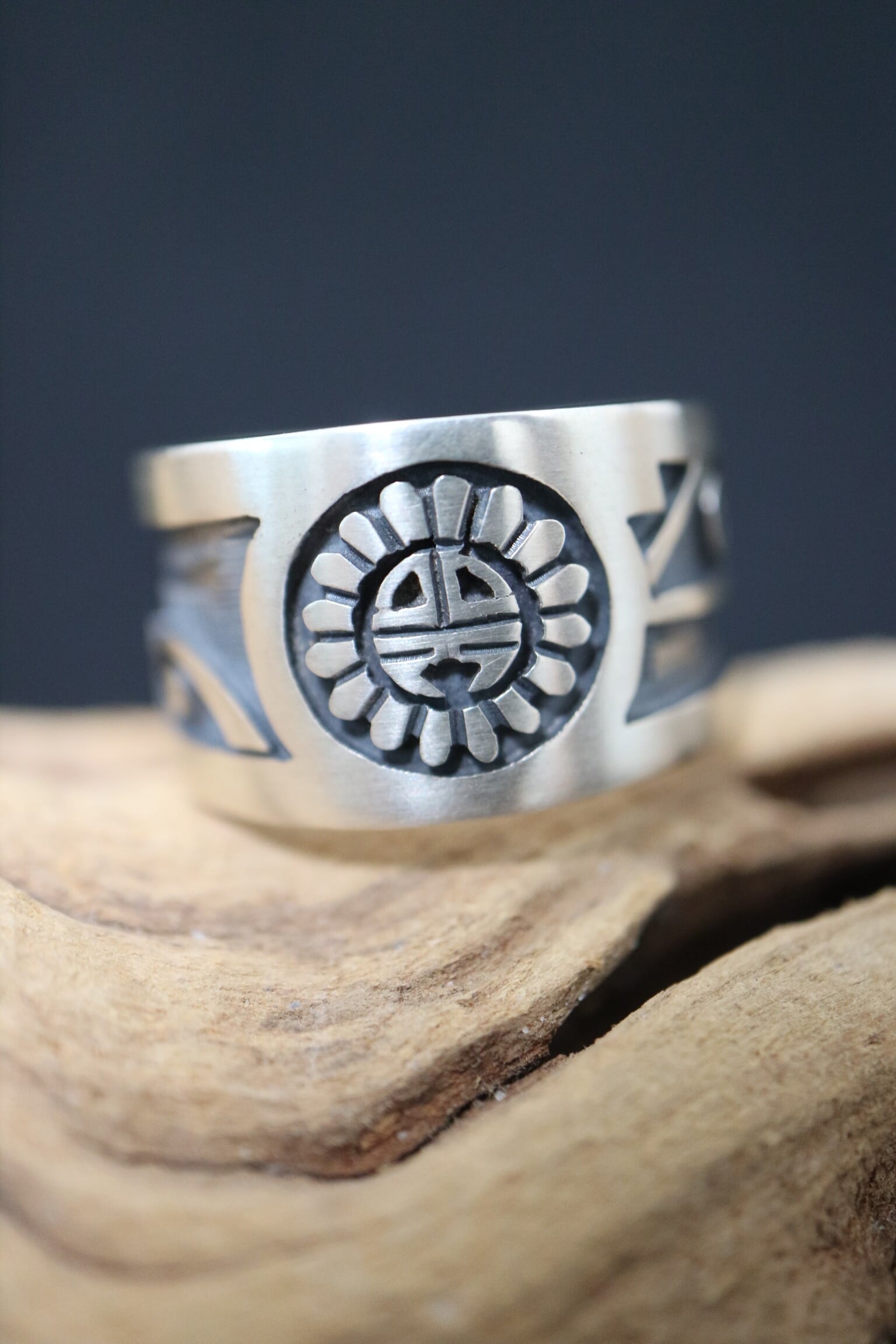 中央に刻まれた サンフェイス(Sunface) は、ホピ族にとって最も重要な象徴のひとつで、太陽の精霊・生命・成長・豊穣・調和 を意味します。太陽はすべての命を育み、自然の循環を支える存在であり、サンフェイスのジュエリーには「持つ人に幸福と安定をもたらす」という願いが込められています。放射状に広がる光のラインと円形の顔は、太陽の恵みと優しさ、そして強さを象徴しています。
