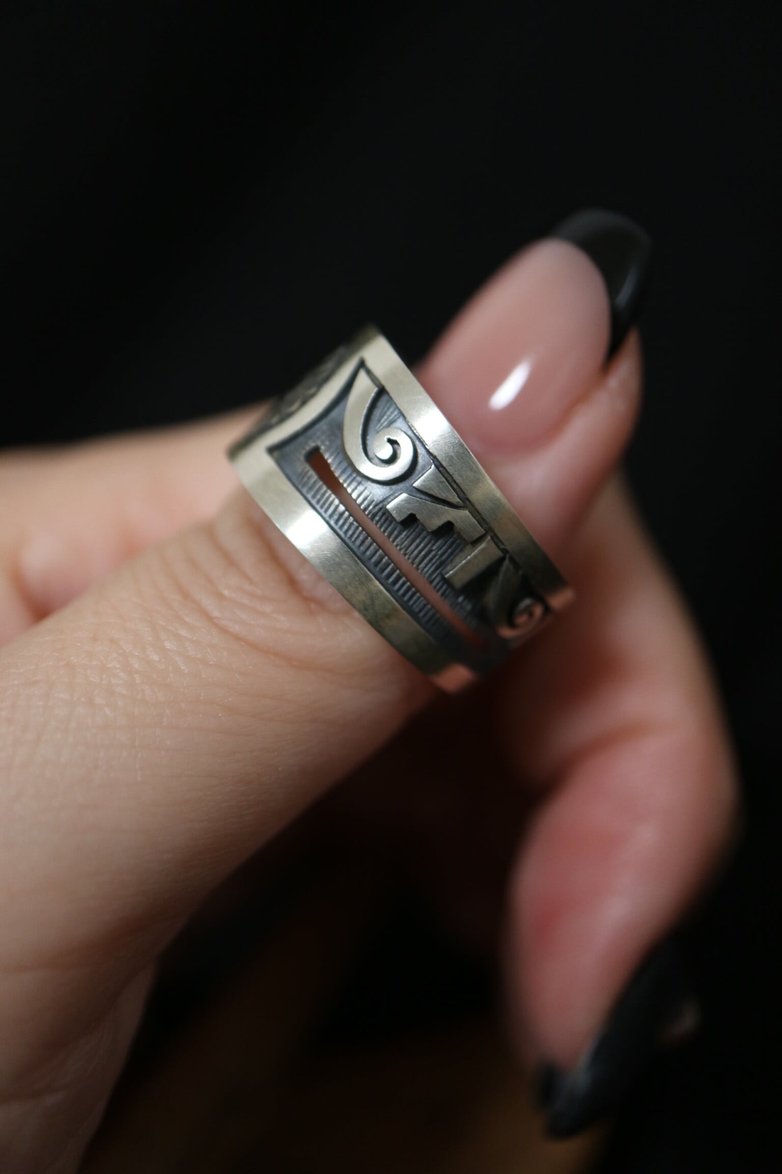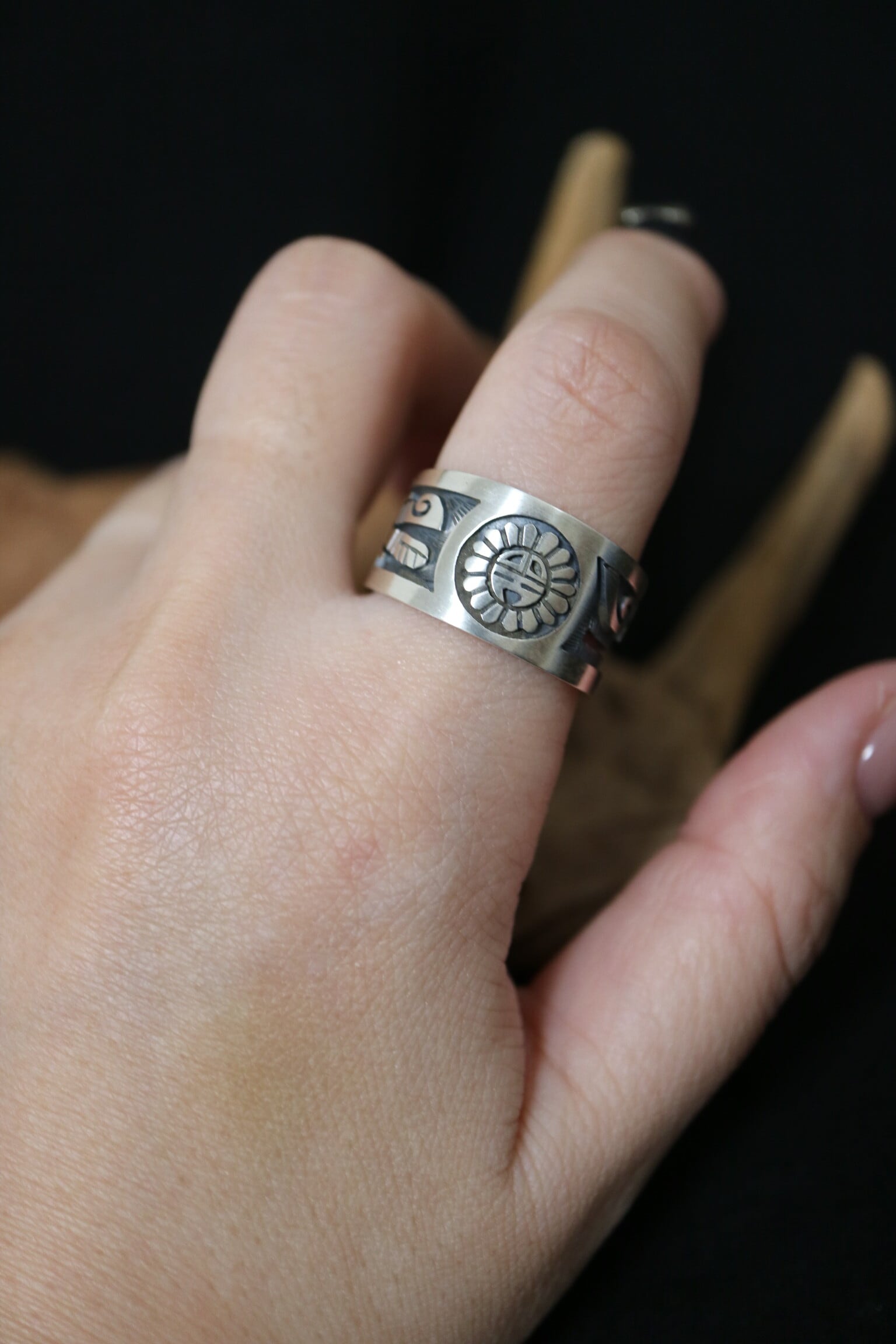 Lucion Koinva はホピ族の中でも非常に評価の高いアーティストで、精密な金属カットと陰影の表現を得意とし、自然や精霊をテーマにしたモチーフを端正で洗練されたスタイルで描くことに定評があります。リングの内側には、彼の作品を示す “LK” のホールマーク と “STERLING” が刻まれ、確かな作家性とスターリングシルバーであることを証明しています。
