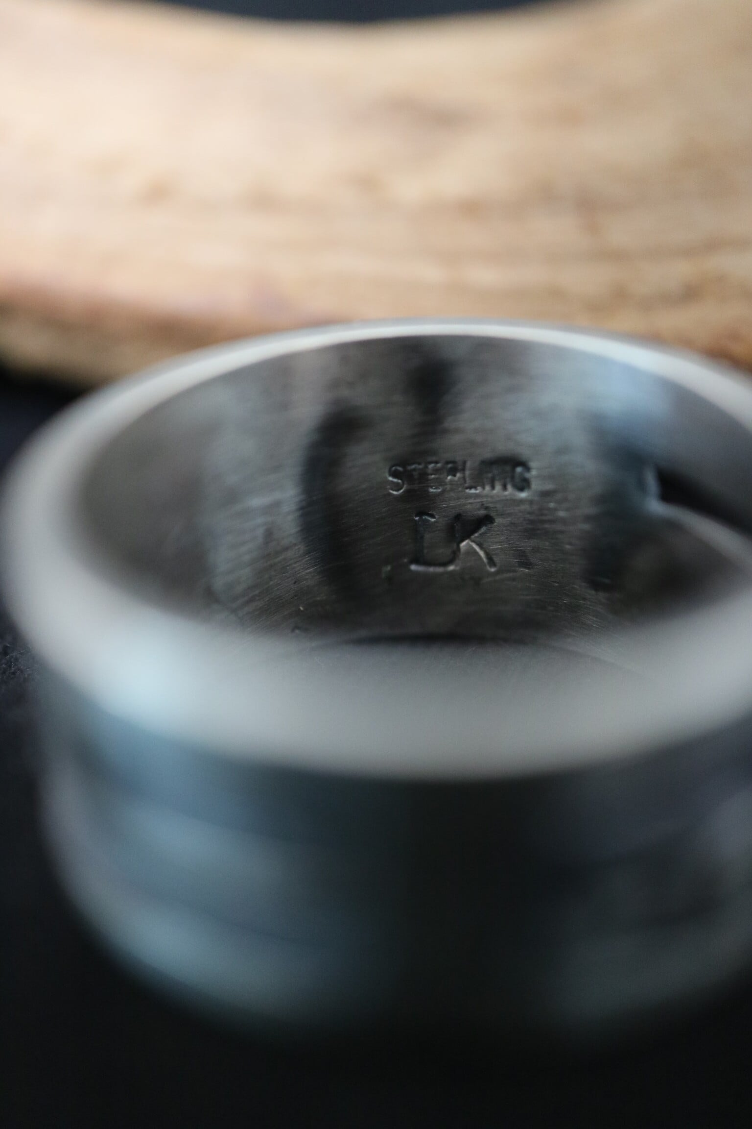 Lucion Koinva はホピ族の中でも非常に評価の高いアーティストで、精密な金属カットと陰影の表現を得意とし、自然や精霊をテーマにしたモチーフを端正で洗練されたスタイルで描くことに定評があります。リングの内側には、彼の作品を示す “LK” のホールマーク と “STERLING” が刻まれ、確かな作家性とスターリングシルバーであることを証明しています。