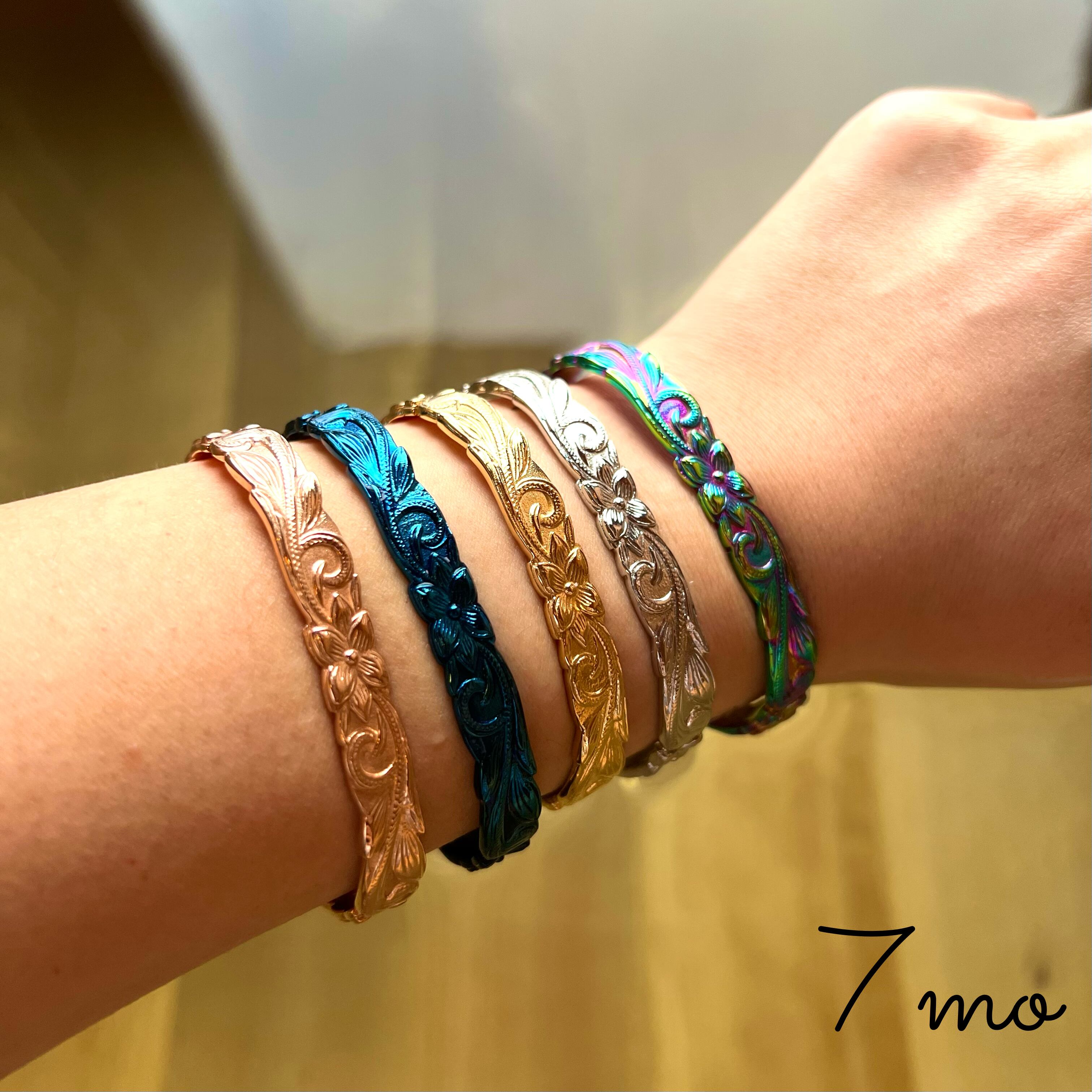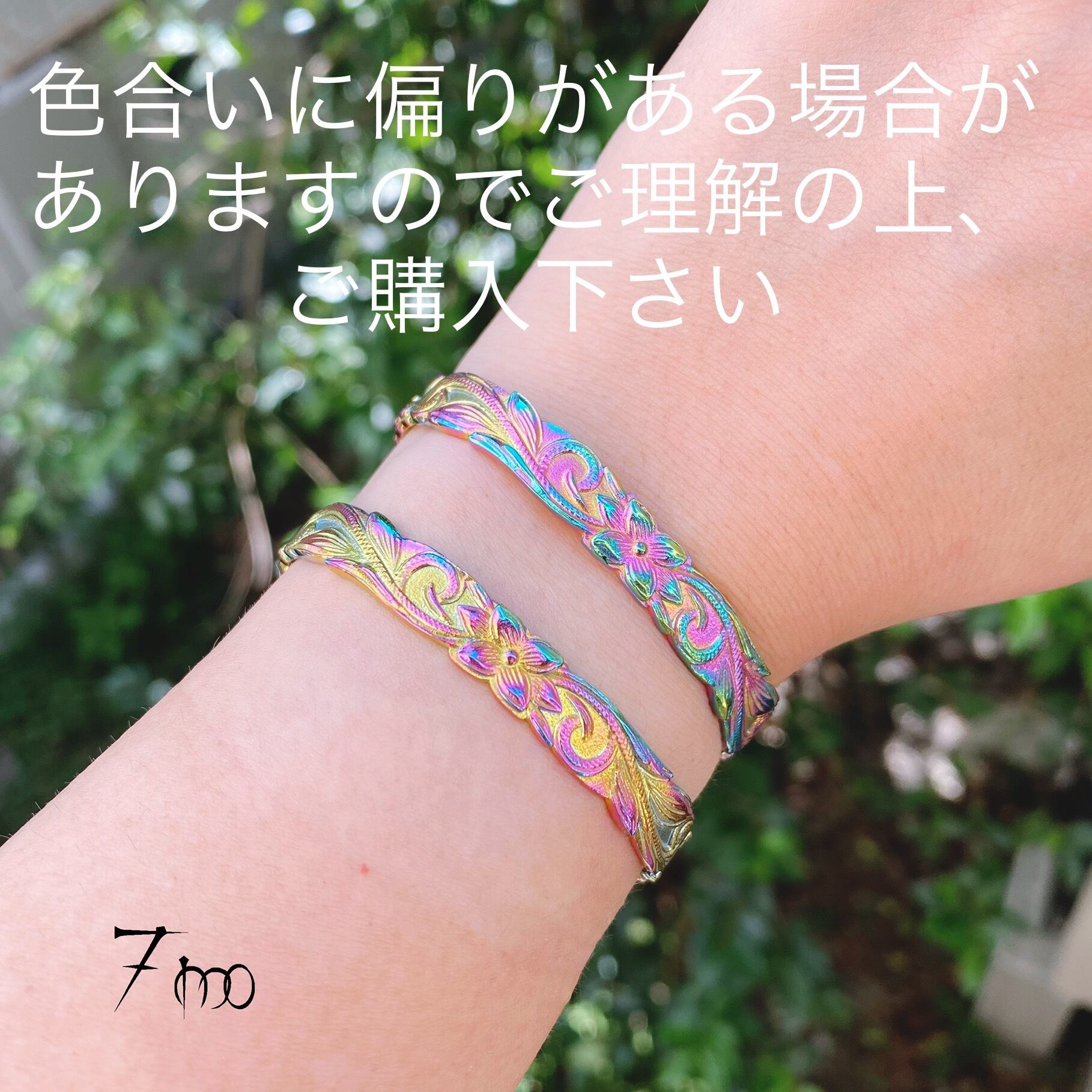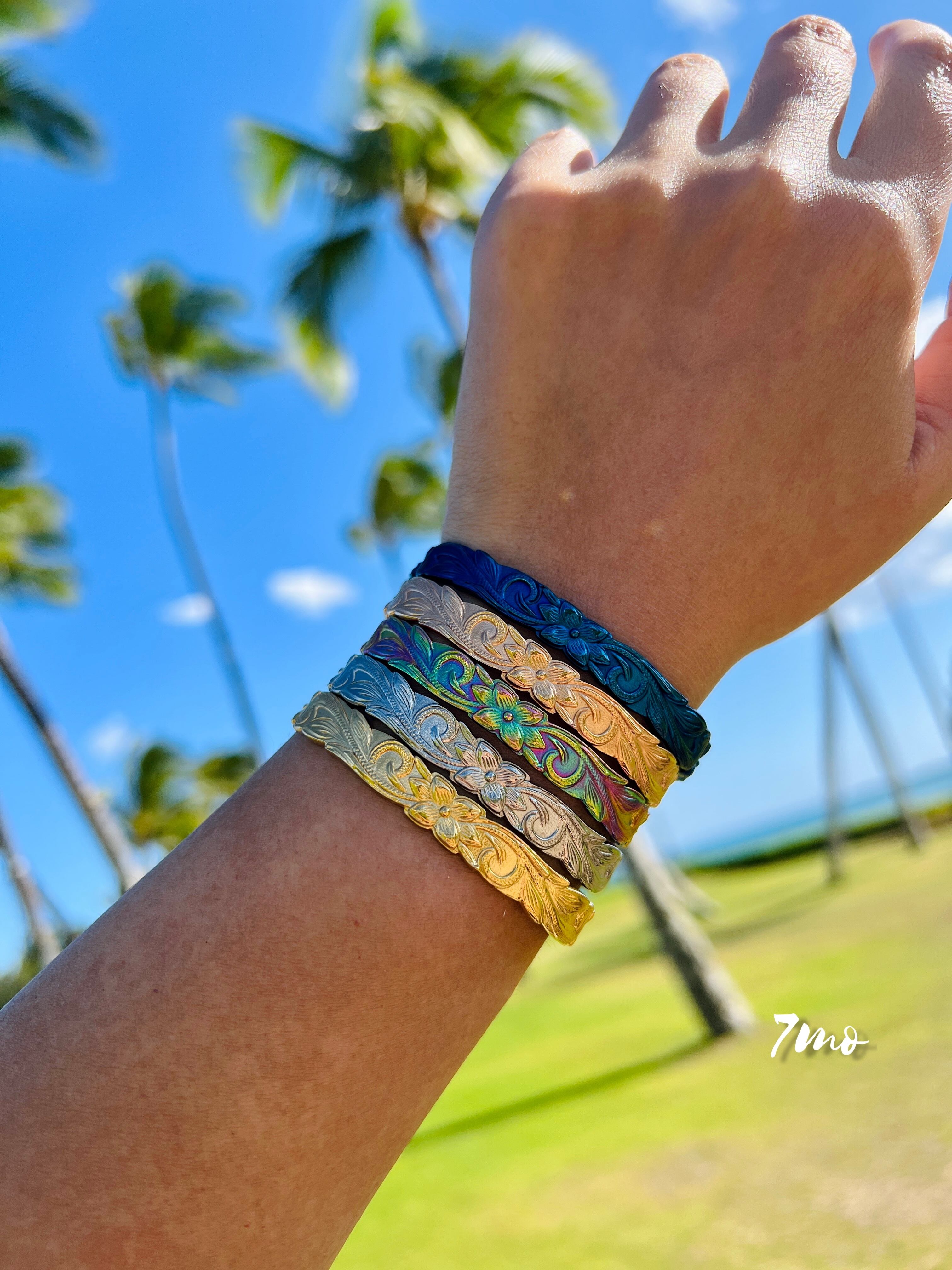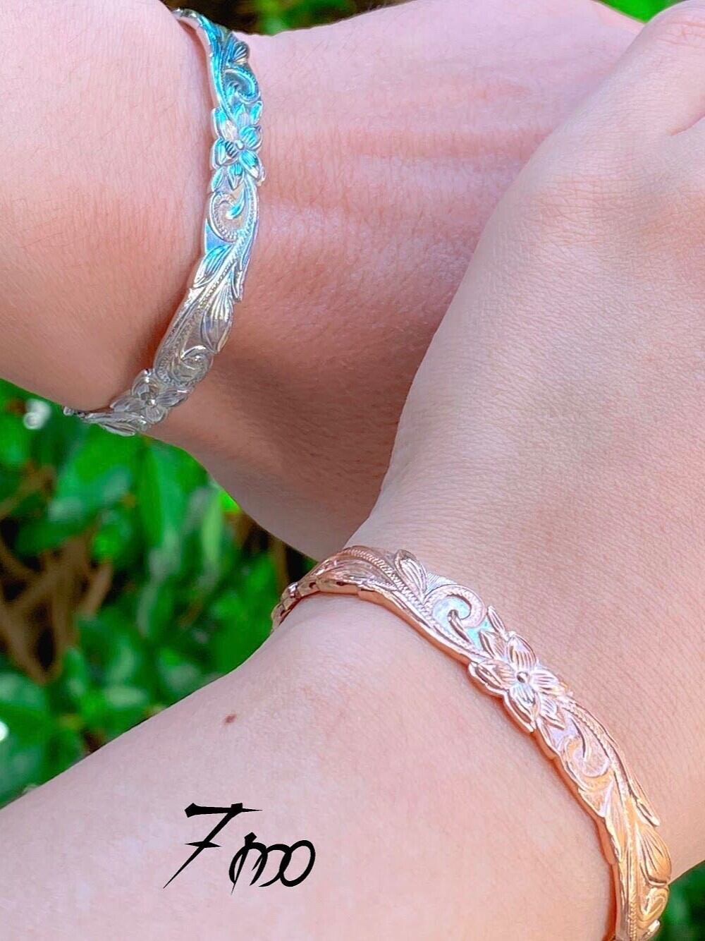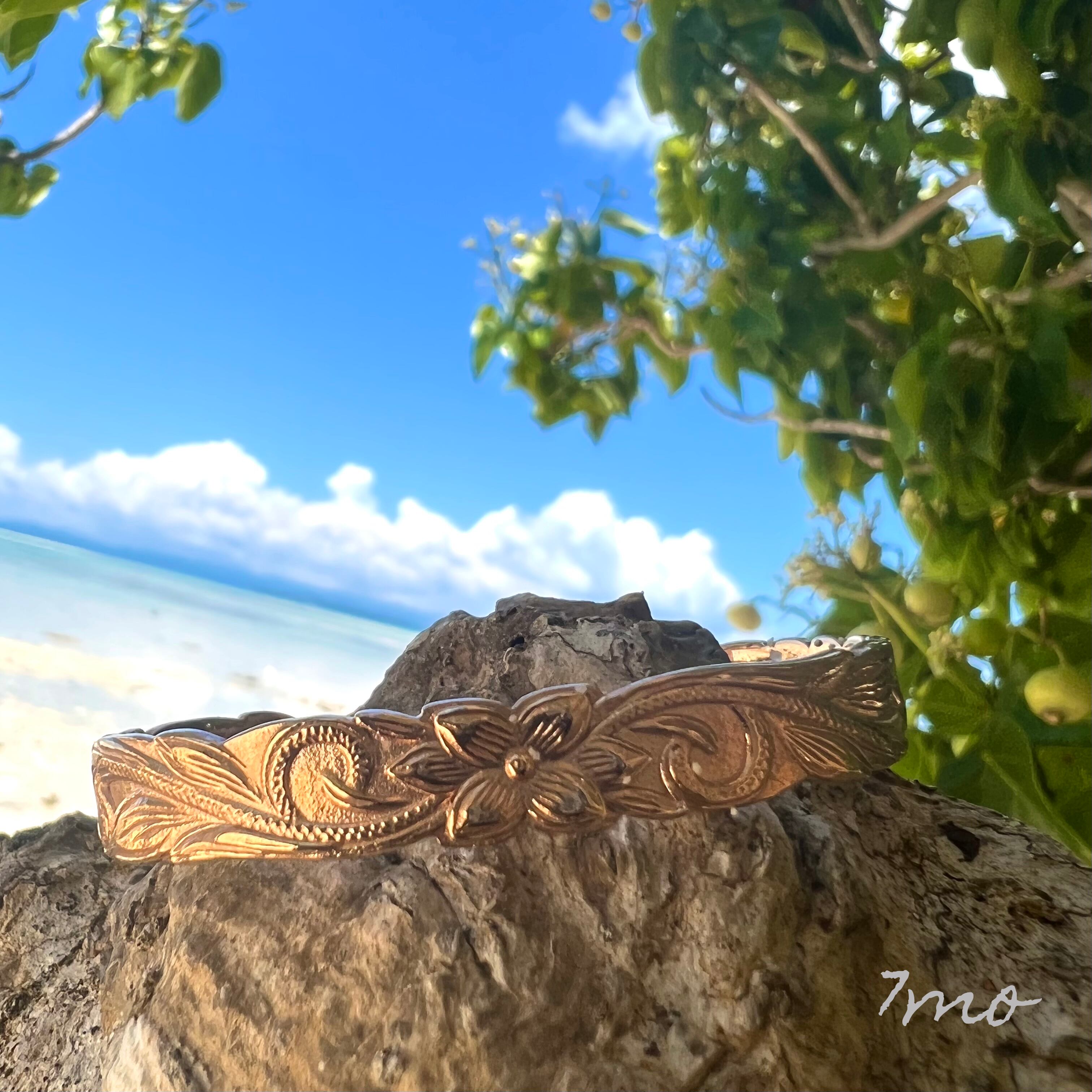 ハワイアンジュエリーの伝統的な彫り「Heritage(ヘリテイジ)」柄と中央にはハワイの代表的な花「Plumeria(プルメリア)」を施した3Dバングルになります。