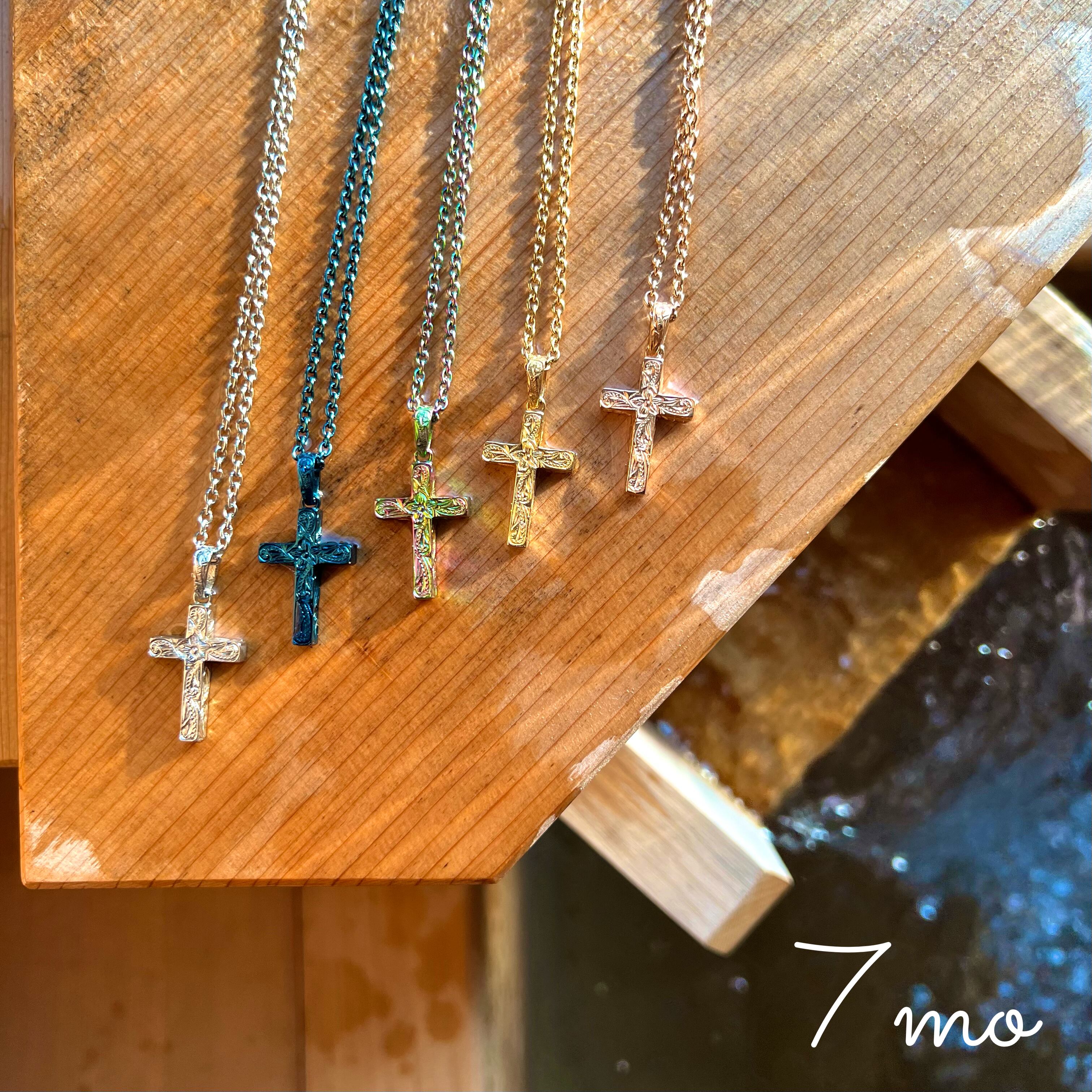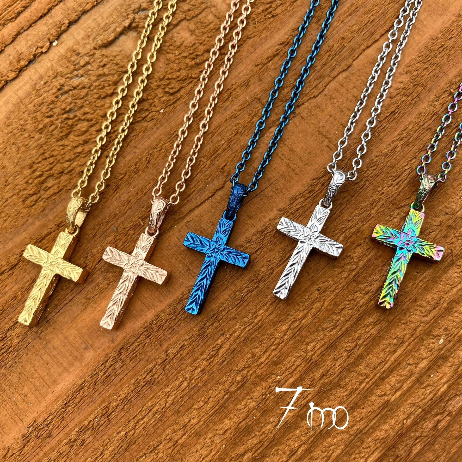 表面にハワイアンジュエリーの伝統的な彫り「Heritage(ヘリテイジ)」柄と裏面には「Maile(マイレ)」柄、更にそれぞれの中央にはハワイの代表的な花「Plumeria(プルメリア)」を施したクロスネックレスになります。